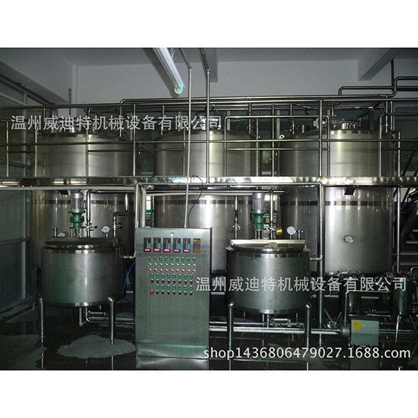處理過的純凈水→蒸汽化糖鍋(白砂糖)→泵→糖漿過濾器→配料罐(純凈水、糖液、果汁與添加劑在其中混合)→泵→雙聯(lián)過濾器→冷熱缸→泵→均質(zhì)機(jī)→冷熱缸→真空脫氣機(jī)→冷熱缸→板式殺菌→保溫罐→高位罐(配置好的成品果汁飲料等待進(jìn)入飲料灌裝機(jī))